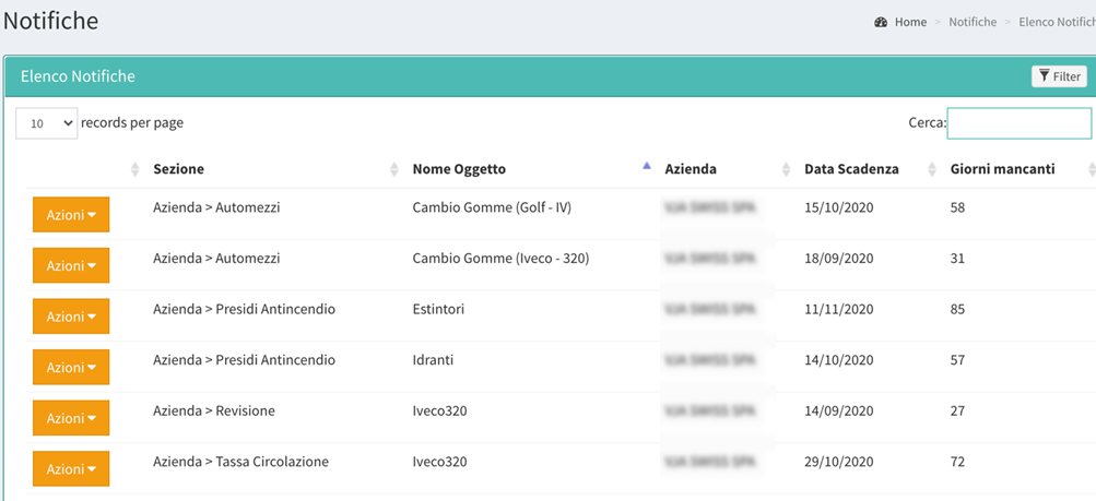 In questa pagina potrai vedere tutte le scadenze delle tue aziende semplicemente cliccando sull’icona a forma di campanella ed agire direttamente ovvero far gestire al tuo cliente.